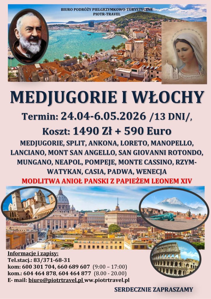 Wyjazd: Białystok 2:00, Siemiatycze 3:30, Łosice 4:00, Międzyrzec 4:30, Siedlce 5:00, Mińsk Maz. 6:00, Dębe Wielkie 6:30, Warszawa 7:00, Mszczonów 7:45, Rawa Maz. 8:30, Piotrków Tryb. 9:30, Częstochowa 11;30 – Msza Św., Katowice14:00, Bielsko-Biała 15:00, Zwardoń 16:00. Przejazd przez Słowację, Węgry i Chorwację. Wyżywienie na terenie Polski we własnym zakresie.