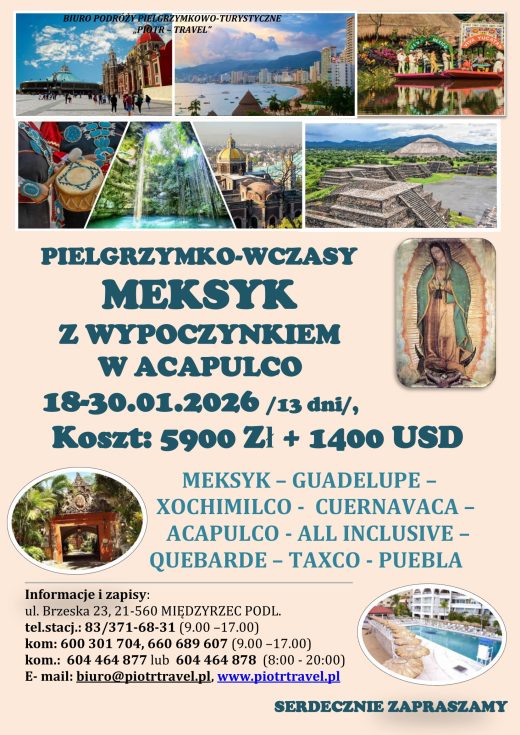 Śniadanie. Msze Św. Pobyt w hotelu i na plaży Relax – wypoczynek nad PACYFIKIEM – wyjątkowo atrakcyjne miejsce do regeneracji sił – kurort światowej sławy. Wyjazd na pokaz skoków do wody z wys. 40 m na Quebarde. Możliwość skorzystania z wycieczek fakultatywnych. Obiadokolacje i noclegi w hotelu.
