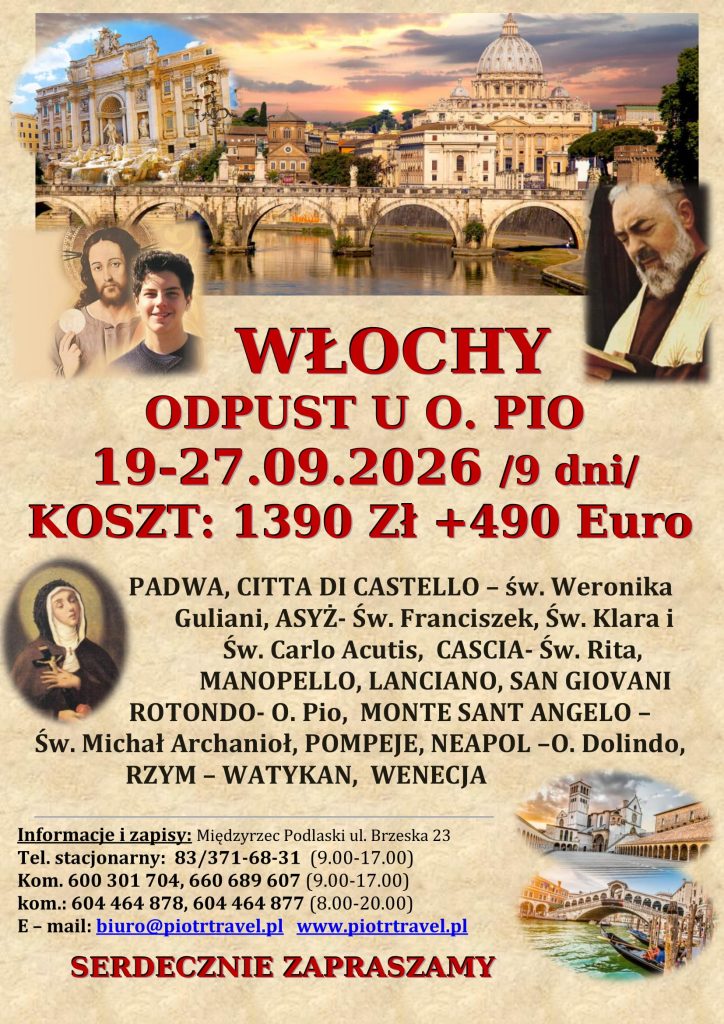 Śniadanie. Zwiedzanie ASYŻU – nawiedzenie Bazyliki św. Franciszka oraz św. Klary, a także innych miejsc związanych z życiem tych świętych. Msza św. w Bazylice św. Franciszka. Nawiedzimy grób młodego świętego Carlo Acutisa w Sanktuarium Wyrzeczenia. Przyjazd do CASCIA- miasta Św. Rity – patronki od spraw trudnych i niemożliwych. Nawiedzenie Bazyliki, Modlitwa przy grobie Świętej. Przejazd na obiadokolację nocleg do hotelu.