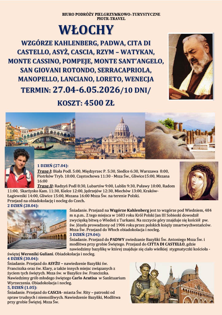 Pielgrzymka do Włoch autokarem śladami świętych to wyjątkowa propozycja duchowej podróży dla osób pragnących pogłębić wiarę oraz nawiedzić najważniejsze sanktuaria chrześcijaństwa. Trasa pielgrzymki prowadzi przez Polskę, Czechy i Austrię do serca Włoch, obejmując miejsca związane z życiem i działalnością wielkich świętych Kościoła katolickiego, takich jak św. Antoni z Padwy, św. Katarzyna ze Sieny, św. Franciszek i św. Klara z Asyżu, św. Rita z Cascii, Ojciec Pio oraz św. Michał Archanioł. W programie pielgrzymki znajdują się m.in. Padwa z Bazyliką św. Antoniego i relikwiami św. Łukasza Ewangelisty, Siena – miasto św. Katarzyny, Asyż z grobem św. Franciszka i św. Klary oraz sanktuarium bł. Carlo Acutisa. Szczególnym momentem pielgrzymki jest pobyt w Watykanie i modlitwa w Bazylice św. Piotra przy grobie św. Jana Pawła II. Uczestnicy nawiedzą również Manoppello z relikwią Oblicza Jezusa, Lanciano – miejsce Cudu Eucharystycznego, Monte Sant’Angelo z sanktuarium św. Michała Archanioła oraz San Giovanni Rotondo – sanktuarium Ojca Pio. Pielgrzymka łączy codzienną Eucharystię, modlitwę i refleksję duchową z wypoczynkiem nad Morzem Adriatyckim w Manfredonii. Program wzbogacony jest o wizyty w Bari z relikwiami św. Mikołaja i grobem królowej Bony, Loreto z Sanktuarium Świętego Domku oraz Wenecję z Placem św. Marka. Całość realizowana jest komfortowym autokarem, a pielgrzymka organizowana jest przez doświadczone biuro pielgrzymkowe Piotr Travel, specjalizujące się w pielgrzymkach zagranicznych.